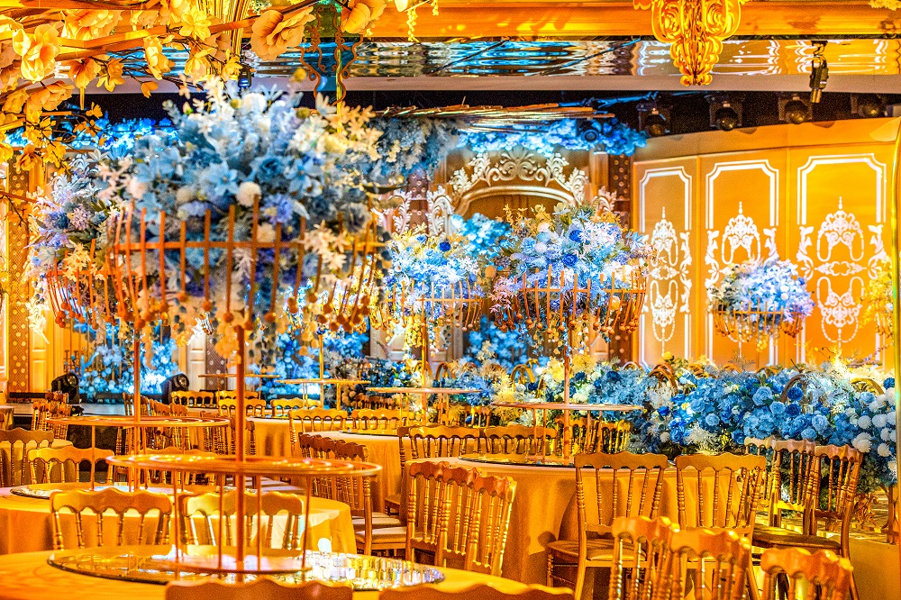 灵感来源于法国巴黎市区的卢浮宫,世界四大博物馆之首,他拥有着全世界奢华和贵族的美誉。让法式的浪漫和高贵血液流淌在这个空间。舞台背景的法式经典雕刻如同时光,记录着经典和永恒,精致的浮雕围栏里藏着浪漫的玫瑰花,但是一种有品味的奢华。金色的雕花围栏贯穿梯台,梯台的尽头流淌着一口喷泉,把聚财聚福的精髓植入到了宴会厅的实中。在梯台的尽头有两只独角兽,现在的年轻人都很喜欢独角兽,因为它象征着爱情,代表着忠贞不二,美好,高贵。独角兽在奔跑,爱情在加速,每对新人都可以在独角兽前去许下相爱一生的承诺。每一张客桌上,都摆放有同样设计风格的大型铁艺花器以及及其抢眼的大型桌花,将整个大厅的空间软化。桌花器皿的高度及形状经过精心测量和设计,能够满足每位来宾和对面来宾的互动和交流,互丌遮挡视线、并且具有通透感。就如同顶部奢华的水晶吊灯和法式雕刻一样,我们用高规格的设计和极其奢华的造价标准,为所有的客人修建一座高贵永恒的卢浮宫。