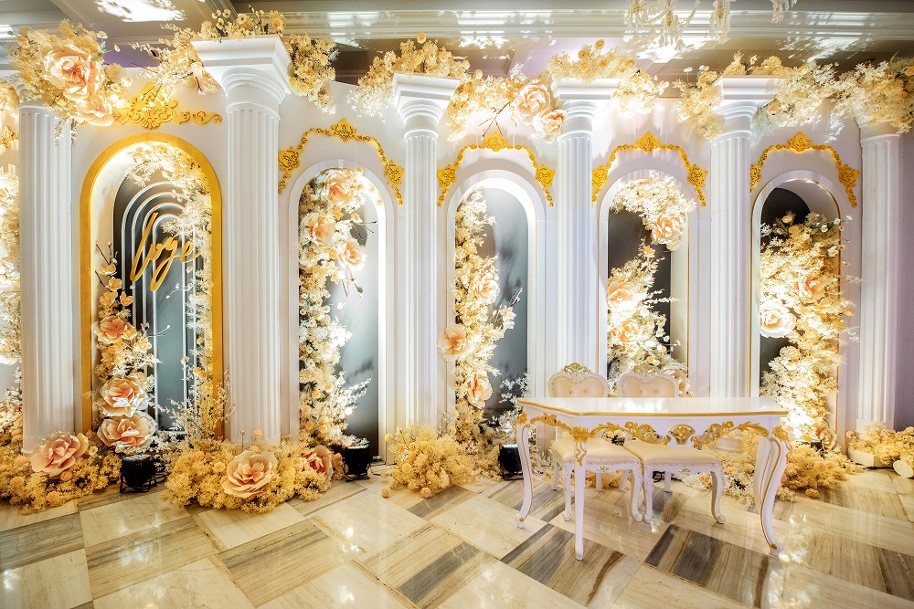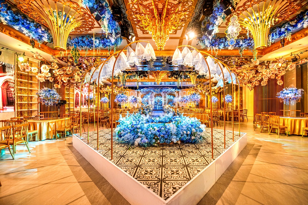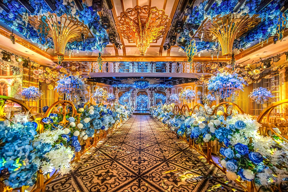 灵感来源于法国巴黎市区的卢浮宫,世界四大博物馆之首,他拥有着全世界奢华和贵族的美誉。让法式的浪漫和高贵血液流淌在这个空间。舞台背景的法式经典雕刻如同时光,记录着经典和永恒,精致的浮雕围栏里藏着浪漫的玫瑰花,但是一种有品味的奢华。金色的雕花围栏贯穿梯台,梯台的尽头流淌着一口喷泉,把聚财聚福的精髓植入到了宴会厅的实中。在梯台的尽头有两只独角兽,现在的年轻人都很喜欢独角兽,因为它象征着爱情,代表着忠贞不二,美好,高贵。独角兽在奔跑,爱情在加速,每对新人都可以在独角兽前去许下相爱一生的承诺。每一张客桌上,都摆放有同样设计风格的大型铁艺花器以及及其抢眼的大型桌花,将整个大厅的空间软化。桌花器皿的高度及形状经过精心测量和设计,能够满足每位来宾和对面来宾的互动和交流,互丌遮挡视线、并且具有通透感。就如同顶部奢华的水晶吊灯和法式雕刻一样,我们用高规格的设计和极其奢华的造价标准,为所有的客人修建一座高贵永恒的卢浮宫。